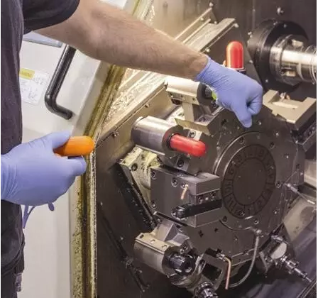 機械工程師Daren Johnson在Swiss Automation公司生產(chǎn)的Eurotech車削加工中心內(nèi)安裝刀具護罩。在某些情況下,員工僅在距離車床轉(zhuǎn)塔刀架數(shù)英寸遠的地方操作,這些安裝護罩可提供必要的防護,以防止碰撞、割傷和擦傷