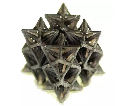材料學和凝聚態(tài)物理學研究表明:材料的熱膨脹性能由正常的晶格振動決定,但同時還受其他物理效應的影響。當其他因素使單胞的體積隨溫度升高而縮小,并且作用大于正常原子非簡諧振動的效果時,材料表現(xiàn)出負熱膨脹性能。經(jīng)過不斷研究,科學家們陸續(xù)報道了各種低熱膨脹材料以及負熱膨脹材料,比如鎢酸鋯(ZrW2O8)系列負熱膨脹材料、鋰霞石(LiAlSiO4)、磷酸鋯鈉(NaZr2P3O12)等。但是由于反常熱膨脹材料的熱力學性質研究相對較少,從而給合成制備熱膨脹系數(shù)可調材料帶來困難。2016年10月25日,美國勞倫斯利物莫爾國家實驗室(LLNL)發(fā)布了研究成果,該實驗室工程師和麻省理工學院(MIT)、南加州大學、加州大學洛杉磯分??茖W家合作,首次利用3D打印技術制備出受熱收縮的超材料結構,如圖1所示。這個新型結構在降溫后還可恢復之前體積,能反復使用,適用于制作溫度變化較大環(huán)境中所需要的精密操作部件,如微芯片和高精光學儀器等。