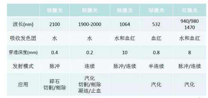 上表對不同波長激光源的穿透深度和發(fā)射模式進(jìn)行了比較,相對鈥激光、釹激光、綠光和紅激光,銩激光治療的優(yōu)勢在于: