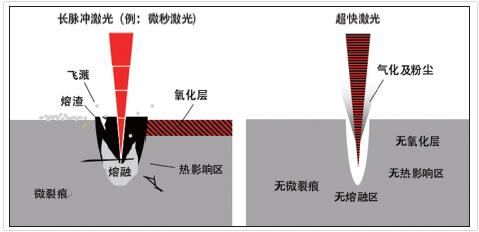 圖一:長脈沖激光及超快激光加工比較示意圖