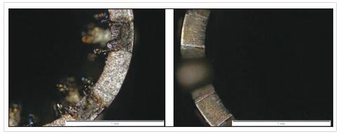 圖四:超快激光切割細304 不銹鋼管。圖左為管子方形槽全貌,圖右為管子對面內(nèi)壁。