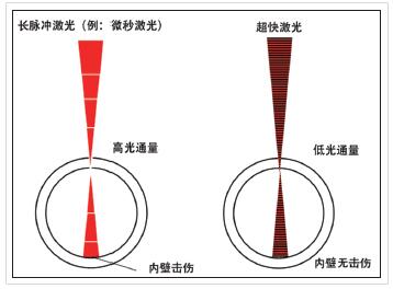 光纖激光的另一個局限是容易擊傷內(nèi)壁。由于光纖激光需要高功率才足以切穿管壁,使光能持續(xù)前進,到達管子對面的內(nèi)壁。即便激光已經(jīng)發(fā)散,光纖激光的高光通量仍然高過材料的損傷閾值,足以擊傷內(nèi)壁。被擊傷的內(nèi)壁不但會降低機械性能,也會弱化支架抗腐蝕的性能。超快激光需要的功率小,當激光切穿管壁后再經(jīng)發(fā)散達到對面的內(nèi)壁時,其光通量已不足擊傷內(nèi)壁,因此不會降低支架性能。
