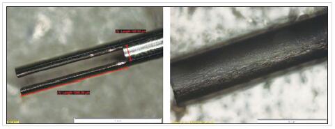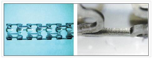 圖十:超快激光切割聚乳酸類支架。圖左為聚乳酸,圖右為聚L- 乳酸。圖十是超快激光切割的聚乳酸類高分子可降解支架。從圖可見,切割面是完整連續(xù)的毛砂面,沒有毛刺,無明顯的熱效應。