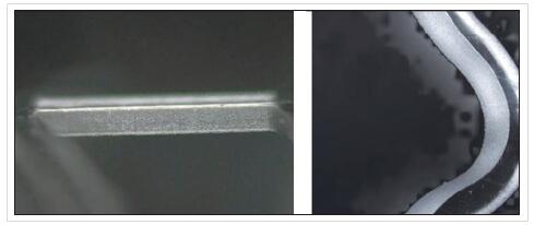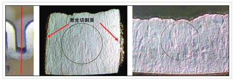 圖四為超快激光在304 不銹鋼管上切割方形槽。圖左顯示,加工區(qū)域的周邊沒有熱效應,切割邊緣沒有熔渣和毛刺。圖右的顯微鏡照片聚焦在管子對面的內(nèi)壁,內(nèi)壁表面干凈連續(xù),沒有擊傷。