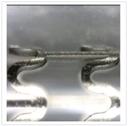 利用金相顯微鏡從支架截面觀察金相,可以看出熱效應是否存在,熱效應會改變金屬晶粒的大小,因此若熱效應存在,則位于切割邊緣附近的晶粒大小會與本體的晶粒不同。圖五為一超快激光切割的316L 不銹鋼支架。如圖左的紅線所示,金相觀察的截面為支架的彎角,該處圖形最復雜,為熱最不易散去的地方。圖中為支架截面的金相,圖右則是作為對照觀察的未加工過的316L 不銹鋼管。晶相從支架與對照的比較看不出差異,且支架的晶相連續(xù),切割邊緣無不同的晶相存在,表示以超快激光切割的該支架不存在熱效應。圖四為支架的局部照片。