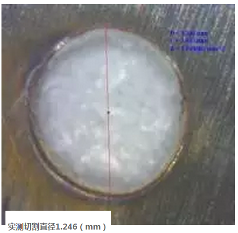 切割0.5mm板材,切割出的最小圓形直徑為0.45mm左右,也即,使用特定光學(xué)配置的切割頭配合銳科RFL-C500連續(xù)光纖激光器能夠切割出的最小直徑為0.45mm圓。