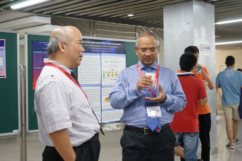 還有來自北京空間機電研究所、成都信息工程大學、中國工程物理研究所應(yīng)用電子學研究所、山西大學、西南技術(shù)物理研究所的研究學者共做了10個口頭報告。山西大學的高英豪講述了“穩(wěn)定的1.06μm壓縮真空態(tài)的制備”。中國工程物理研究院應(yīng)用電子學研究所的陳小明、王君濤分別作了題為“多通道Nd:YAG之字形板條放大器中的準連續(xù)波超熒光光源”和“高效準連續(xù)1064 nm平面波導激光放大器”的報告。西南技術(shù)物理研究所的安國斐講述了“考慮有害過程的端面泵浦銫蒸氣激光器中的放大自發(fā)輻射”。北京空間機電研究所的沈振民、劉勛分別講述了“空間碎片清理的激光光學捕獲”和“基于天基絲狀激光器的多分量大氣探測技術(shù)”。西南技術(shù)物理研究所的陳劍、蔡和分別作了題為“硅PIN陣列的混合集成光電探測器”和“具有MOPA結(jié)構(gòu)的1.617 µm激光器理論分析”的報告。成都信息工程大學大氣科學學院的謝慧玲、范琪分別講述了“使用激光雷達檢測和分析非降水邊界層”和“激光雷達用于航空氣象學中的風切變識別”。