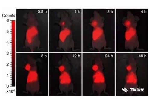 小鼠注射攜帶藥物的納米球后不同時(shí)間點(diǎn)的體內(nèi)熒光圖像