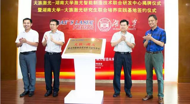 2016年9月12日,“大族激光-湖南大學(xué)激光智能制造技術(shù)聯(lián)合研發(fā)中心”揭牌儀式暨“湖南大學(xué)-大族激光研究生聯(lián)合培養(yǎng)實(shí)踐基地”簽約儀式在大族激光全球生產(chǎn)基地舉行。