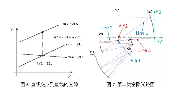 第二類空隙是指某視場(chǎng)上、下邊緣光線的交點(diǎn)到某邊緣光線的距離。如圖6所示,兩條相交直線的方程為Y=m·Z+b和Y=m·Z +c,另外一條直線的方程為Y=k·Z+a,交點(diǎn)坐標(biāo)為(Y1,Z1),則交點(diǎn)到直線的空隙為ΔY。