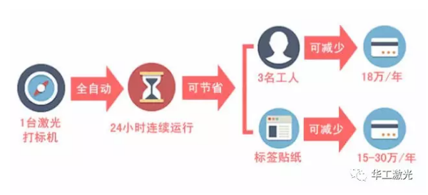 從企業(yè)運營成本考慮,先進的激光打標技術能為企業(yè)節(jié)省不少費用。假設一名工人每月人工成本為5000元,每天24小時不間斷生產需3名工人輪班,標簽市場價約為0.05—0.1元/個,1臺激光打標機一年可為企業(yè)節(jié)約至少33萬元成本費用。