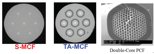 光子晶體光纖具有靈活的空間排布工藝技術,可利用光子晶體復用光纖技術制造空分多芯光纖,如雙芯光纖、7芯光纖、19芯光纖等(如圖7)。Jun Sakaguchi等利用長16.8km的7芯光纖、97路100GHz間隔的WDM波分復用通道、2路PDM傳輸86-Gb/s的QPSK信號,總速率達到109Tb/s。7芯光纖傳輸串擾很低,可以忽略不計。該實驗首次突破了以往100Tbit/s的單纖傳輸容量限制,打破了原有的世界紀錄,顯現(xiàn)出作為未來大容量傳輸媒質的多芯光纖巨大潛力。該研究團隊采用19芯光纖傳輸高達305TB/s的信號。
