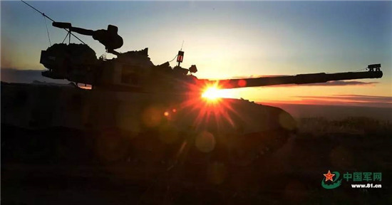 裝甲部隊(duì)在進(jìn)行戰(zhàn)場(chǎng)快速機(jī)動(dòng)??梢钥匆?jiàn)坦克炮口的“武器模擬交戰(zhàn)系統(tǒng)”。
