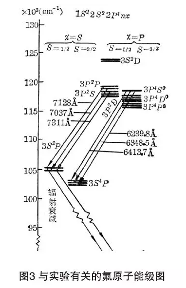 經(jīng)查對(duì),氟原子有3P4S-3S4P的一組躍遷,正好與我們的測(cè)定值吻合。