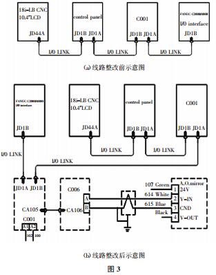 在 FANUC 18i-LB 系統(tǒng)上增加變形鏡穿孔功能需增加一個端子型 I/O 模塊基本模塊和擴展模塊 E,具體的線路整改詳見圖 3。