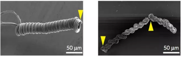 至于處于這兩條線之間的激光,其功率則可以成功的讓蜘蛛絲半融化,體積稍微擴大一圈;在照射偏離中心的位置時,還能讓蜘蛛絲進行彎曲。通過對照射時間的控制,研究人員們可以精準控制彎曲的具體度數(shù)。目前,他們已經(jīng)用蜘蛛絲成功做出了螺線管、彈簧、以及復(fù)雜的結(jié)扣。