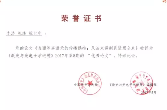 南京大學(xué)現(xiàn)代工程與應(yīng)用科學(xué)學(xué)院李濤教授、祝世寧院士研究組在過去幾年中發(fā)展并推廣了一套新穎的面內(nèi)衍射調(diào)控SPP波的方法,實(shí)現(xiàn)了諸如Airy波束、準(zhǔn)直波束、寬帶聚焦與波分復(fù)用等效應(yīng)和功能。后來他們進(jìn)一步將全息思想引入進(jìn)來,實(shí)現(xiàn)了在金屬表面蜿蜒行走的SPP波束。相關(guān)研究大大加深了人們對SPP波束特性的理解,并提供了強(qiáng)大的微納光場調(diào)控的手段。今年五月份,李濤教授受邀在《激光與光電子學(xué)進(jìn)展》發(fā)表綜述文章《表面等離激元的傳播操控:從波束調(diào)制到近場全息》,系統(tǒng)介紹了該領(lǐng)域的研究進(jìn)展(該綜述論文被評為該刊物第五期優(yōu)秀論文,見圖一)。該文章后半部分還強(qiáng)調(diào),等離激元近場全息將可能是今后發(fā)展的重要方向。