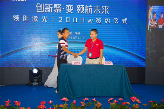 萬瓦新品發(fā)布會后,隨即就引起巨大反響。泰州騰達激光董事長周偉先生決定當場購買領(lǐng)創(chuàng)激光的12000W設(shè)備并現(xiàn)場與領(lǐng)創(chuàng)激光簽訂購買合約,此次合同的簽訂也是我國國內(nèi)第一臺12000W激光設(shè)備的成交記錄。