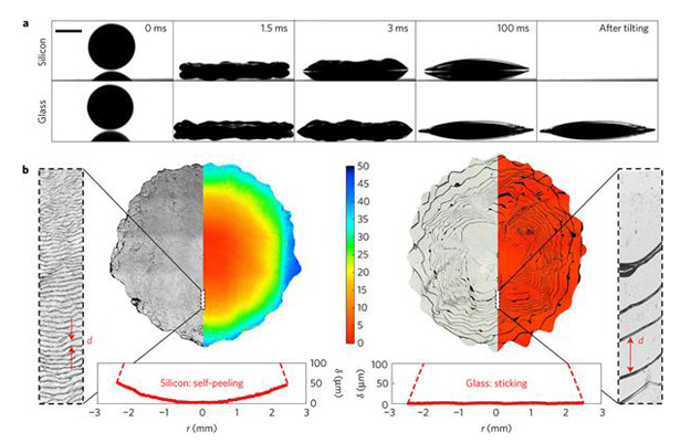 這一切都是在一臺熱敏高速攝像機上拍攝的,它顯示“當冰塊凍結時,液滴意外地卷曲起來并從表面上分離出來。”研究人員創(chuàng)造了“自剝”一詞來描述這種卷曲和分離現(xiàn)象。“這種現(xiàn)象的主要成分是短時間流動動力學之間的相互作用,這種動力學確定了附著力,并導致更長的時間尺度的熱效應。知道這一點,研究人員可以組合一個“設計圖”,其中概述了關鍵的熱性質 - 溫度,滴落和底物的揮發(fā)性等 - 影響液滴是否會粘附,反彈或“自剝”。