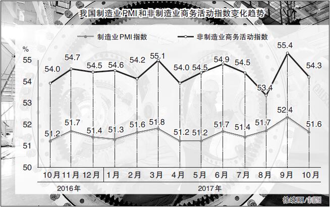 當天發(fā)布的數(shù)據(jù)還顯示,10月份,中國非制造業(yè)商務活動指數(shù)為54.3%,比上月回落1.1個百分點,持續(xù)位于擴張區(qū)間,非制造業(yè)繼續(xù)保持平穩(wěn)較快的增長態(tài)勢。