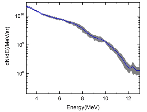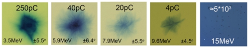 在國家重大儀器專項、重大科學問題導向項目(973A))、XXX專項和協(xié)同創(chuàng)新等項目的支持下,顏學慶教授、陳佳洱院士領(lǐng)導的北京大學激光加速器團隊攻克了高對比度與高光強激光技術(shù)、自支撐納米薄膜靶制備技術(shù)、超高流強離子束傳輸技術(shù)和激光加速器輻照研究平臺等關(guān)鍵技術(shù),最終建成世界上首臺超小型激光加速器輻照裝置(如圖1所示),加速參數(shù)指標為1~15 MeV質(zhì)子束,總流強106-8個粒子/發(fā)。2017年激光加速器裝置正式建成出束,并通過了同行專家的現(xiàn)場技術(shù)測試。實驗中利用能譜儀、RCF和CR39,確認加速產(chǎn)生了能量1-15 MeV 質(zhì)子束(如圖2所示),在加速穩(wěn)定性測試實驗中,進行了5發(fā)連打測試,顯示質(zhì)子截止能量的穩(wěn)定性好于3%(如圖3所示)。