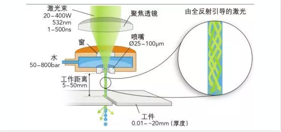 噴嘴射出的低壓水射流通過水- 氣界面的全內(nèi)反射來引導(dǎo)激光束。水射流直徑通常介于30μm -80μm之間,所需激光功率在10W~200W之間。盡管原理看似簡單,但工藝上能夠做到如今這般的精細(xì),則經(jīng)過了多年的實驗和優(yōu)化。
