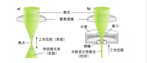 圖2:傳統(tǒng)干式激光(a)和LMJ 水導(dǎo)激光工藝(b) 的調(diào)焦機制對比