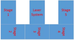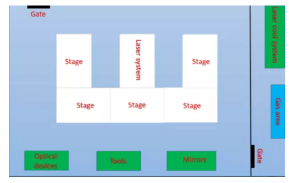 接著是另一種相對(duì)而言比較少見(jiàn)的布局方式,各個(gè)光學(xué)平臺(tái)之間彼此分開(kāi)。這種布局方式比較適用于數(shù)量較多的小型試驗(yàn)系統(tǒng)。各個(gè)系統(tǒng)彼此分開(kāi),互不影響??拷す馄鞯钠脚_(tái)只需留出前端的一小部分作為激光傳播到后續(xù)平臺(tái)的空間即可。當(dāng)然這種方法的缺點(diǎn)也非常明顯,處于后端的實(shí)驗(yàn)平臺(tái)接收到的激光品質(zhì)會(huì)下降。如果室內(nèi)建設(shè)不達(dá)標(biāo),會(huì)對(duì)飛秒激光的脈寬影響較大。