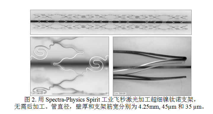 幾乎從一開始,支架制造就運用了納秒激光切割技術(shù)。然而,納秒激光與金屬的相互熱作用通常使加工完的金屬表面達不到最理想,毛刺、熔化和重鑄都是激光熔融切割的標(biāo)準(zhǔn)特征。此外,材料中熱積沉在切口旁邊產(chǎn)生了熱影響區(qū)(HAZ)。在熱影響區(qū)中,材料的物性或構(gòu)成會被改變。因此,清潔、去毛刺、蝕刻和最終拋光因此也被納入常規(guī)加工工序中,使支架表面性能達到植入設(shè)備標(biāo)準(zhǔn)水平,而通過使用飛秒激光進行支架加工可以避免一些前面提到的后加工步驟。圖1顯示了由Spirit®激光加工的鎳鈦諾微型支架。關(guān)鍵特點包括嚴(yán)密的加工公差、無熱影響區(qū),脆性晶格結(jié)構(gòu)無熱誘導(dǎo)變形,以及非常干凈的切割邊緣。