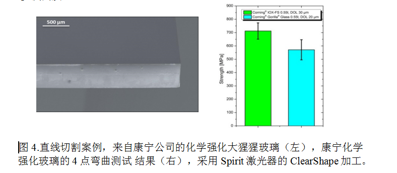 例如,切割康寧的厚度為0.55毫米化學(xué)強化大猩猩玻璃,應(yīng)力層深度(DOL)為20μm,速度可達4米/秒。除了切削自由邊緣,使用ClearShape工藝實現(xiàn)了激光切割(由截面的平均粗糙度定義)<0.1μm的質(zhì)量(見圖四,左)。非常高的切割質(zhì)量使在玻璃的四點彎曲試驗期間達到了700MPa的極高的彎曲強度,而無須任何后處理步驟(圖4,右)。