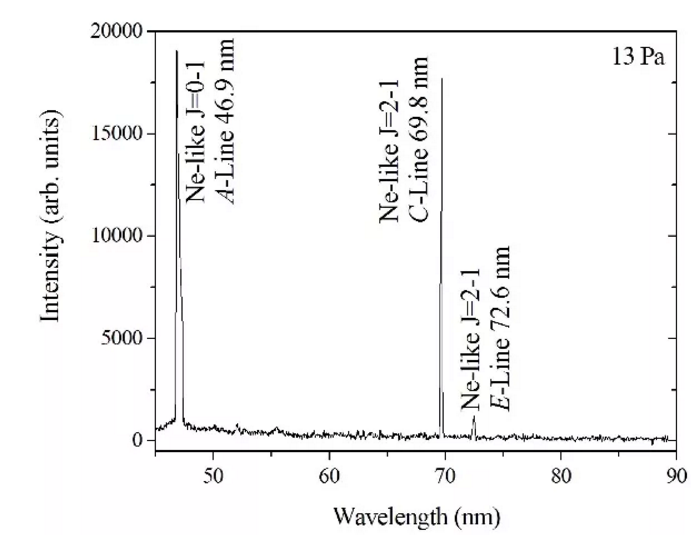 在放電電流幅值12 kA時,首次獲得了類氖氬(Ar8+)69.8 nm和72.6 nm激光輸出,并可同時獲得46.9 nm、69.8 nm和72.6 nm多波長激光輸出,如下圖所示。目前已獲得46.9 nm和69.8 nm激光的增益飽和輸出,并實現(xiàn)了69.8 nm激光的雙程放大。此外,采用26 kA的放電電流已獲得46.9 nm激光的深度飽和輸出,并正在開展更大電流下軟X射線激光的研究工作。利用聚焦后的46.9 nm激光已開展燒蝕大能帶隙材料的實驗研究工作。