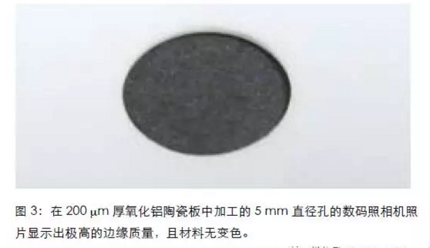然而,由于該材料的硬度和某種程度上的脆性,這些優(yōu)勢同樣伴隨著精密加工的挑戰(zhàn)。使用 IceFyre 的短皮秒脈沖結(jié)合高速多遍環(huán)鉆工藝,我們在該材料中高質(zhì)量、高產(chǎn)量地切割出直徑5 mm 的孔。圖 3 顯示加工孔的數(shù)碼照相機(jī)照片。每個(gè)孔的加