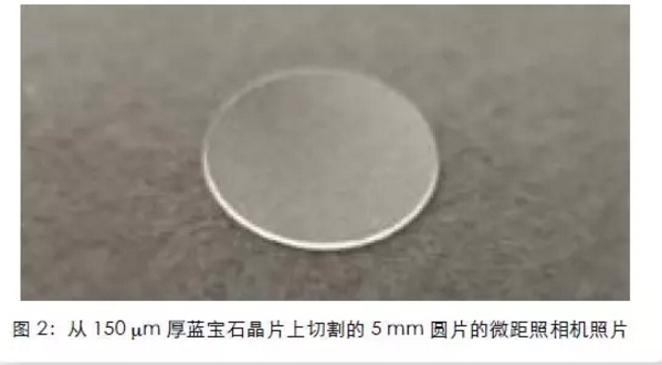 人造藍(lán)寶石幾十年來一直用于手表蓋板,如今作為按鈕和照相機(jī)窗口等組件的堅(jiān)固抗劃傷材料,越來越多地在移動設(shè)備中使用。在這些測試中,我們從 150 μm厚 C-面雙面拋光藍(lán)寶石上加工出小型圓盤。對于此類極薄的脆性材料,開發(fā)高平均功率激光器的高速工藝非常具有挑戰(zhàn)性。經(jīng)過精心的IceFyre 皮秒激光器工藝優(yōu)化,我們在約 1.5 秒內(nèi)切割出直徑 5 mm 的圓盤。圖 2 顯示圓盤的照相機(jī)微距照片。該照片顯示良好的薄藍(lán)寶石材料加工質(zhì)量,無可見碎屑, 并且切割邊緣光滑磨砂。