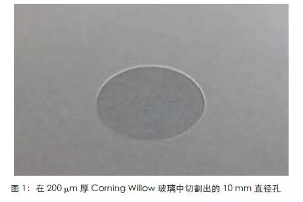 在用于制造個(gè)人移動設(shè)備的薄玻璃中,皮秒激光器已證明尤其有價(jià)值。封閉形狀切割對按鈕、揚(yáng)聲器開口、照相機(jī)窗口等特征的集成很重要。使用 IceFyre 激光器結(jié)合高速多程環(huán)鉆切割工藝,我們在 200μm厚Willow玻璃上切割出了直徑10 mm 的孔。圖 1 顯示完整切口的數(shù)碼照相機(jī)微距照片??浊懈顣r(shí)間約為 2.5 秒,燒蝕邊緣看起來非常光滑。經(jīng)光學(xué)顯微鏡檢查確定,邊緣碎屑通常為 0-10 μm,切割邊緣的表面輪廓數(shù)據(jù)顯示粗糙度 Ra 為 <1 μm。