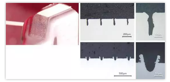 圖1 示出了兩種不同的凹槽幾何形狀:頂部是使用連續(xù)波(CW)單模光纖激光器打造的樣式,其特征是頂部帶有小的重鑄結構的不規(guī)則橫截面凹槽,而底部是采用一款納秒脈沖激光器打造的樣式,特征是在頂部具有大的重鑄結構的規(guī)則凹槽形狀。