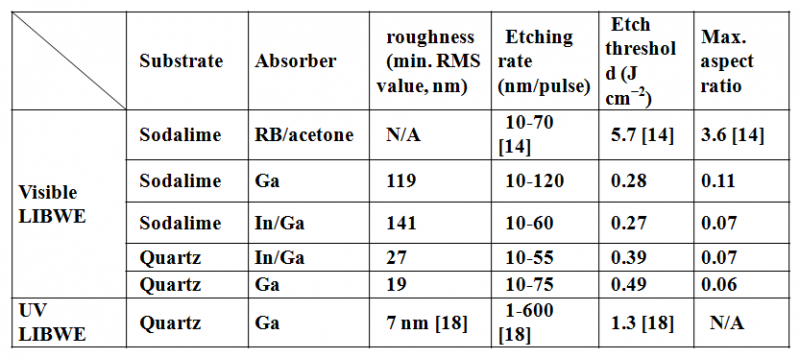 表1. UV-LIBWE與Visible LIBWE的蝕刻結(jié)果比較表[10]