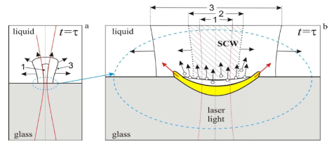 利用單一脈沖波模式來解釋LIBWE蝕刻過程的機制;在a和b中,紅色曲線表示聚焦在玻璃/液體界面上的激光束; 1表示觀察到90%激光能量的區(qū)域; 2為激光脈沖末端高溫超臨界水(SCW)的擴展面積; 3是高液壓的擴大區(qū)域。帶箭頭的空白圓圈表示超臨界水高溫蒸發(fā)和玻璃蝕刻的過程;黃色的區(qū)域表示軟化的玻璃的體積,其通過高液壓沿著邊緣被擠出。[21]
