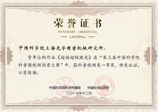 上海光機(jī)所原創(chuàng)科普微視頻“超強(qiáng)超短激光”榮獲中國科學(xué)院科普微視頻創(chuàng)意大賽一等獎