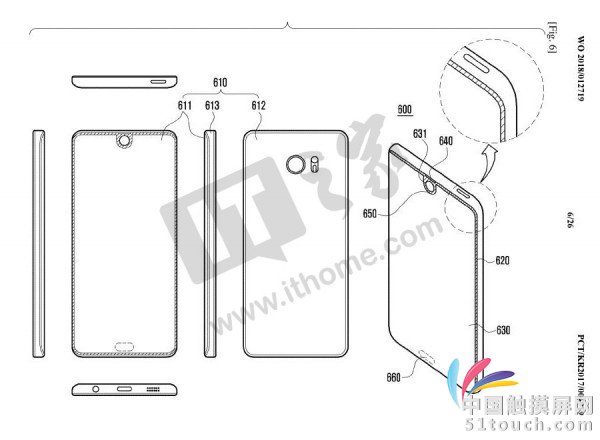 另外,該專利明確表明,指紋識別模塊將會回歸到手機(jī)正面,同樣有兩種方案:一種是目前業(yè)內(nèi)比較認(rèn)可的屏下指紋方案,另外一種則依然是通過打洞的方式,在屏幕上預(yù)留一個用于安裝物理按鈕的孔,指紋識別掃描器將會被集成在孔中。