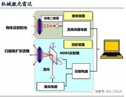 機(jī)械激光雷達(dá)由光電二極管、MEMS反射鏡、激光發(fā)射接受裝置等組成,其中機(jī)械旋轉(zhuǎn)部件是指圖中可360°控制激光發(fā)射角度的MEMS發(fā)射鏡。