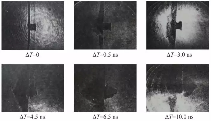 (4)     利用主激光束分光與空間光路延遲,采用受激布里淵散射技術(shù)產(chǎn)生零抖動同步精度的探針激光,在國內(nèi)首次獲得了不同時刻黑腔靶解體過程的圖像(1987年),初步驗證了黑腔靶實驗的科學(xué)可行性,見圖4。