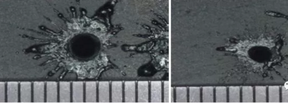 顧名思義就是利用占空比小的高峰值脈沖激光,輔以噴射在材料表面上的不燃油以清除開孔邊緣附著物,控制脈沖的合理頻率邊冷卻邊穿孔。其特點(diǎn)是相對炸孔雖然時間稍長(3秒),但穿出的孔徑?。sφ4mm)且開孔邊緣無附著物以及入熱較低,便于接下來的正常切割加工,相比普通穿孔則效率提高了4倍。圖3.示出了普通穿孔、HPP穿孔和高能穿孔的區(qū)別。