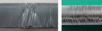 圖1.和圖2.示出了加工中厚板時經(jīng)常會遇見的切割斷面,這樣的切割不僅成品質(zhì)量受到質(zhì)疑,還會伴隨著過燒和嚴(yán)重的粘渣出現(xiàn),以致體現(xiàn)不出高價的激光加工機(jī)區(qū)別于其他切割手段的價值。