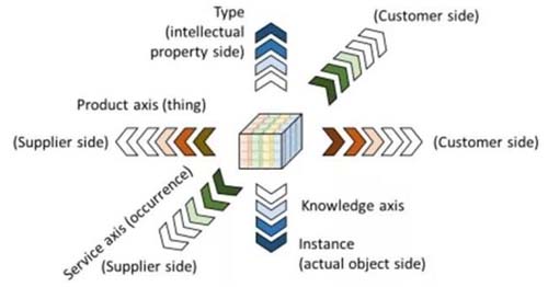 第三個軸:知識軸,是不同尋常的一個提法。它將物理實體作為空間數(shù)據(jù)模型的一個用例(instance)來看待,這意味著其分類信息、三維造型等都在賽博空間中找到對應(yīng)類型(Type)。這其中自然涉及到大量的信息轉(zhuǎn)化為知識的結(jié)果。物理實體變成用例,是數(shù)字化制造過程的一個重要步驟,這是工業(yè)互聯(lián)網(wǎng)時代的一個典型特征。一切皆可數(shù)據(jù)化。