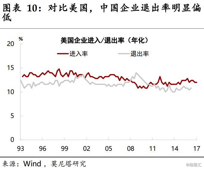 對中國而言,姑且不論是否會有新技術(shù)的涌動勃發(fā),在新技術(shù)能否實現(xiàn)有效的傳播與擴散上,或許面臨著更大的挑戰(zhàn)。按熊彼特的 “創(chuàng)造性破壞”理論,創(chuàng)新是不斷地從內(nèi)部革新經(jīng)濟結(jié)構(gòu),不斷破壞舊的、創(chuàng)造新的結(jié)構(gòu)。從現(xiàn)實角度理解,新技術(shù)傳播擴散的過程要求在一個行業(yè)里企業(yè)是“有進有出、有生有死”的。在2012年經(jīng)濟減速以后,中國確實出現(xiàn)了企業(yè)進入率的大幅提升,但企業(yè)退出率仍處低位。根據(jù)國家工商行政管理總局發(fā)布的數(shù)據(jù)計算,中國登記企業(yè)的占比從2012年的14.3%快速上升到21.3%;而破產(chǎn)企業(yè)占比則仍處于5.5%左右(圖表9)。對比美國,其企業(yè)進入、退出率相對均衡,均保持在10-15%的區(qū)間內(nèi)(圖表10)。