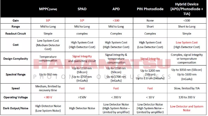 濱松可用于激光雷達(dá)的光半導(dǎo)體探測器對比