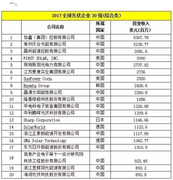 在光伏領(lǐng)域,中國公司已經(jīng)占據(jù)了全球壟斷地位,下圖是2017年4月365光伏發(fā)布的全球光伏20強(qiáng),這是一個(gè)綜合性排名,不只是組件,還包括電池片,硅片等,外國公司只有6家,其中美國2家,德國2家,韓國和日本各1家。