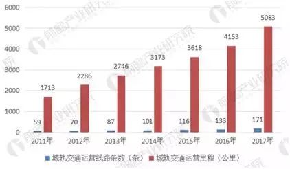 2016年末,中國大陸共計(jì)30個(gè)城市開通軌道交通運(yùn)營,運(yùn)營線路長度達(dá)高達(dá)4153公里。到2017年12月31日,中國大陸35座城市開通運(yùn)營軌道交通線路,總里程高達(dá)5083.45公里。一年的時(shí)間全中國軌道交通線路長度增長了22.4%(數(shù)據(jù)來源:前瞻產(chǎn)業(yè)研究院)。