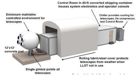 LLGT為LLCD的主要地面終端,這是一個移動型地面接收系統(tǒng)。具有溫控外殼,高約4.5m,總質(zhì)量7t,與目前的無線電通信地面天線相比,尺寸和重量減少約75%。 LLCD 的目標之一是演示驗證多孔徑合成光信號收發(fā)技術(shù)。