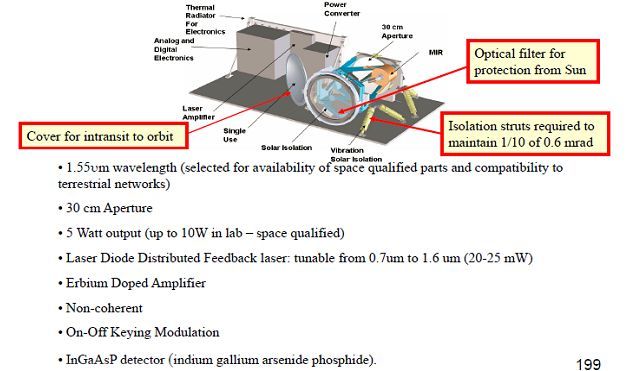 星間距離可長達4萬km,而激光波束的強度是按距離的平方遞減的,也就是說衰減可能達到-152 dB。接收機要有超高的靈敏度才行,否則背景輻射等噪聲產(chǎn)生的誤碼率將使接收機無法接收。目前,除提高檢測器本身靈敏度外,還在探討外差接收及糾錯編碼等途徑。